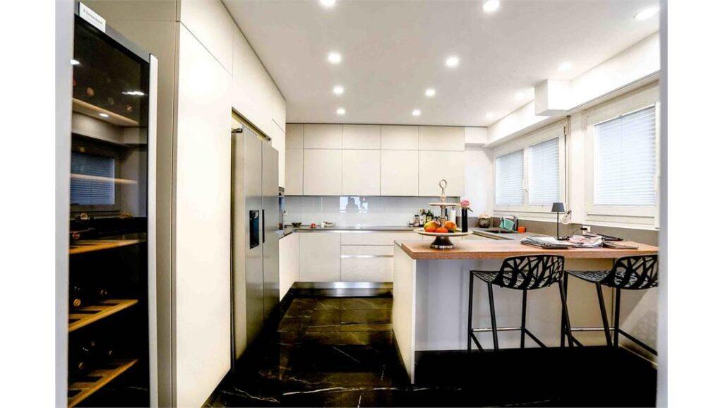 La zona giorno è articolata in tre ampi saloni contigui, destinati a soggiorno, sala da pranzo e area relax con camino. Spazi concepiti sia per la vita quotidiana sia per momenti di rappresentanza, con un’atmosfera elegante e misurata. La cucina è abitabile e separata, pensata per garantire funzionalità e ordine, senza interferire con la zona living. L’insieme degli ambienti riflette le caratteristiche tipiche di un appartamento di lusso affitto ben progettato.