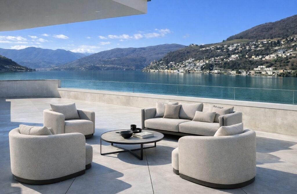 Dal soggiorno si accede direttamente a una terrazza panoramica fronte lago, un’estensione naturale della zona living che diventa uno spazio sospeso tra cielo e acqua. Qui il tempo rallenta: il silenzio, i riflessi dell’acqua e l’orizzonte aperto creano un contesto ideale per il relax, la lettura o un aperitivo al tramonto.