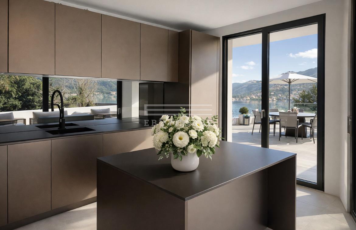 Il cuore della villa è la cucina di design con isola centrale, moderna e perfettamente integrata con la zona giorno. Pensata come vero spazio conviviale, è il luogo ideale per condividere momenti, profumi e sapori con famiglia e amici, sempre accompagnati dalla presenza scenografica del lago sullo sfondo.