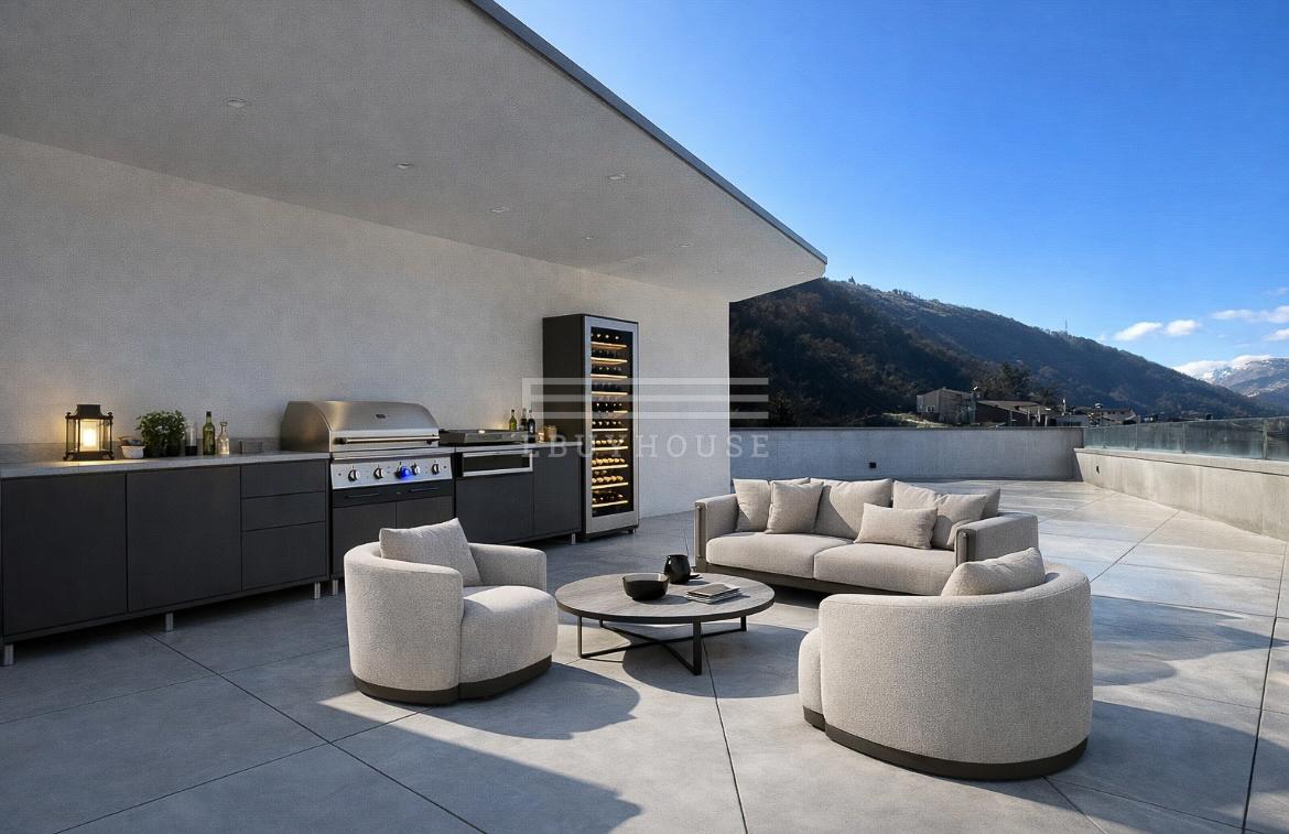 Un vero elemento distintivo è la terrazza sul tetto, grande quanto l’intera abitazione. Questo straordinario spazio panoramico, con vista lago aperta e senza confini, è predisposto per una cucina esterna e un’area barbecue, trasformandosi in uno scenario esclusivo per cene sotto le stelle e momenti di convivialità con vista sull’acqua.