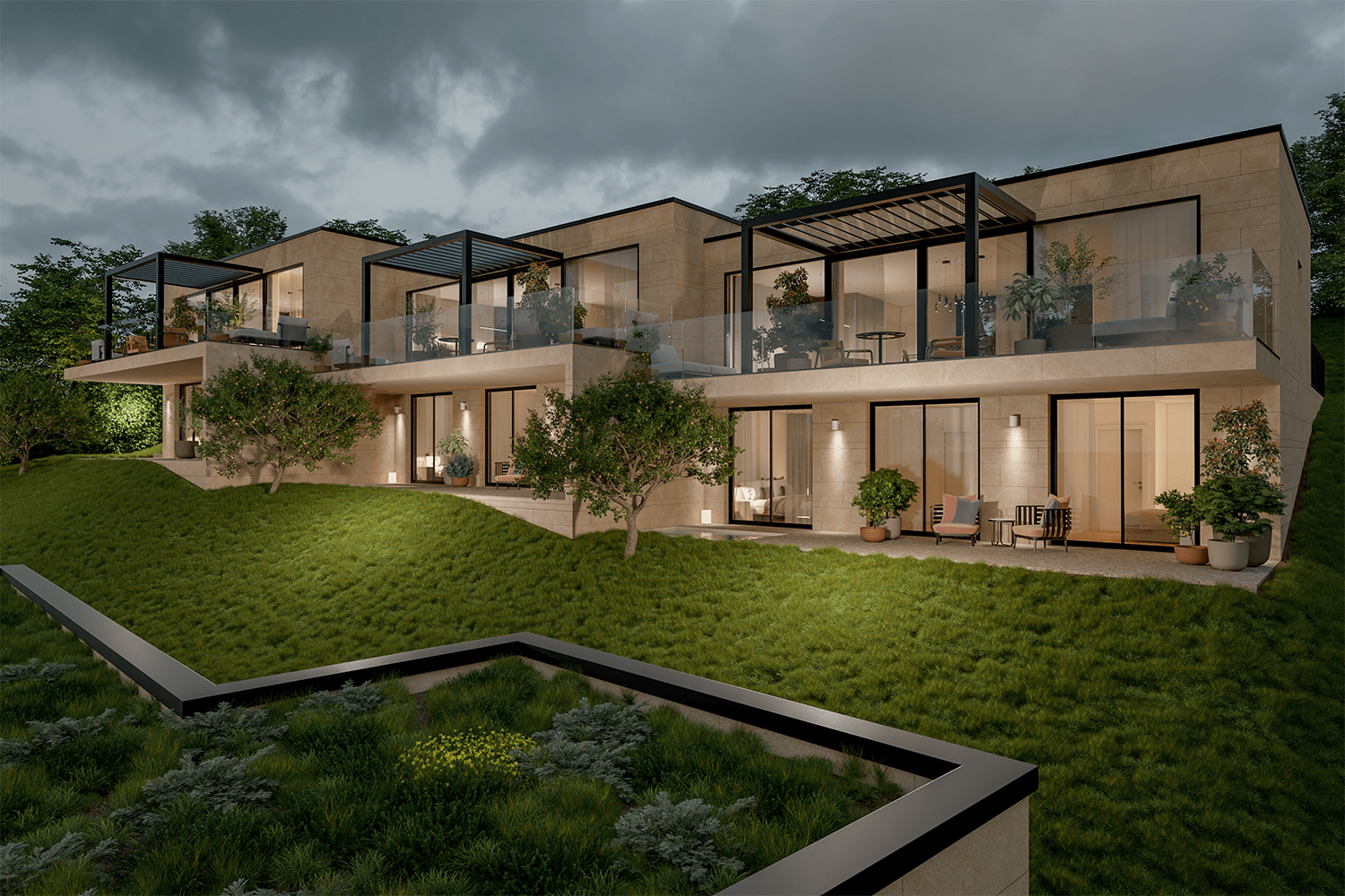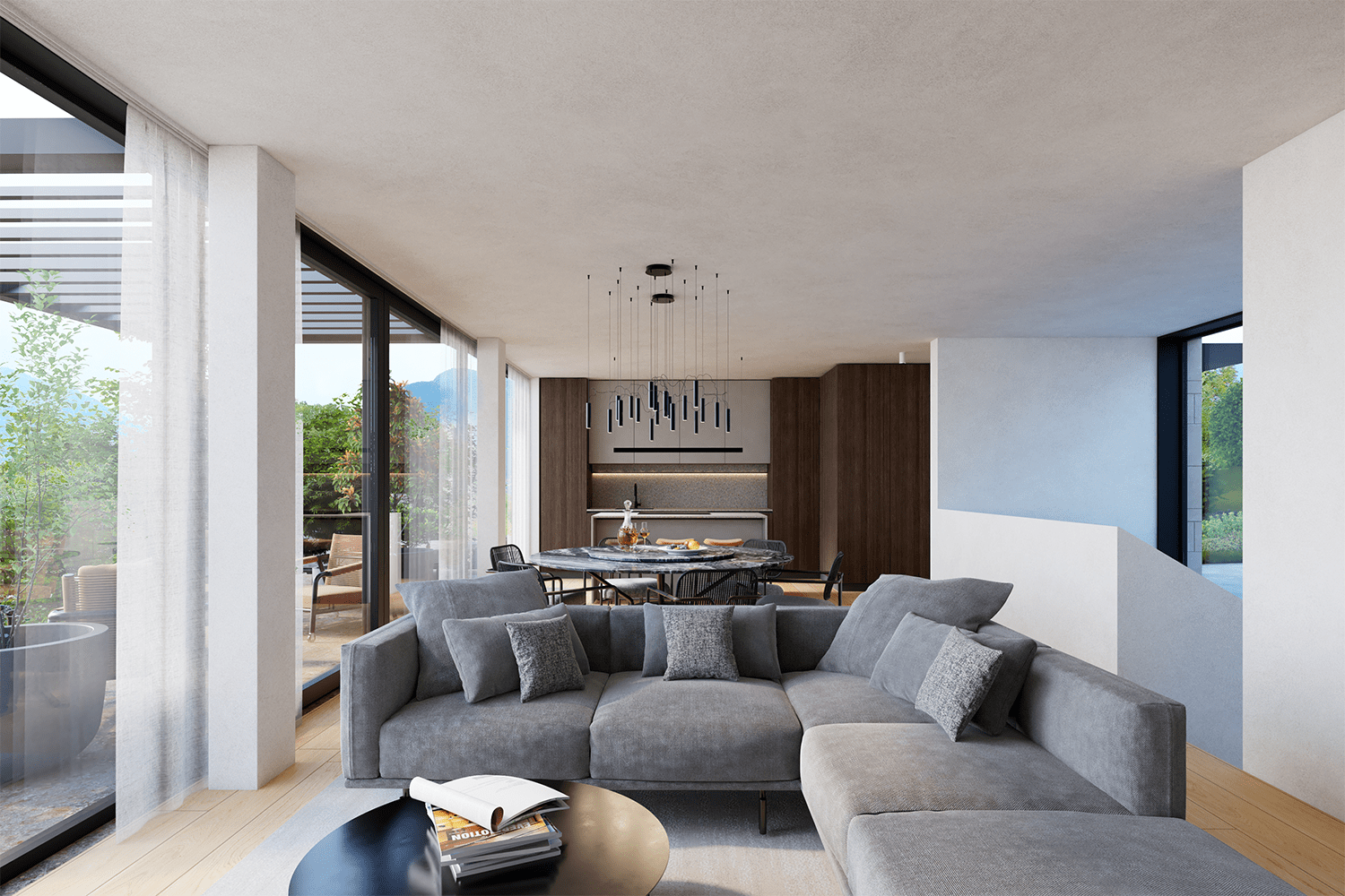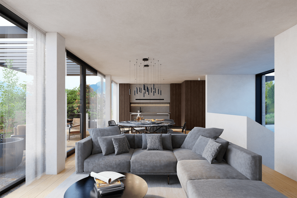La zona giorno rappresenta il fulcro dell’abitazione: un ambiente aperto, luminoso e accogliente, dove cucina e living dialogano in modo armonioso. La presenza di una pergola bioclimatica amplia ulteriormente la vivibilità degli spazi, rendendo questa villa di lusso Collina d’Oro ideale sia per la vita quotidiana sia per momenti conviviali.